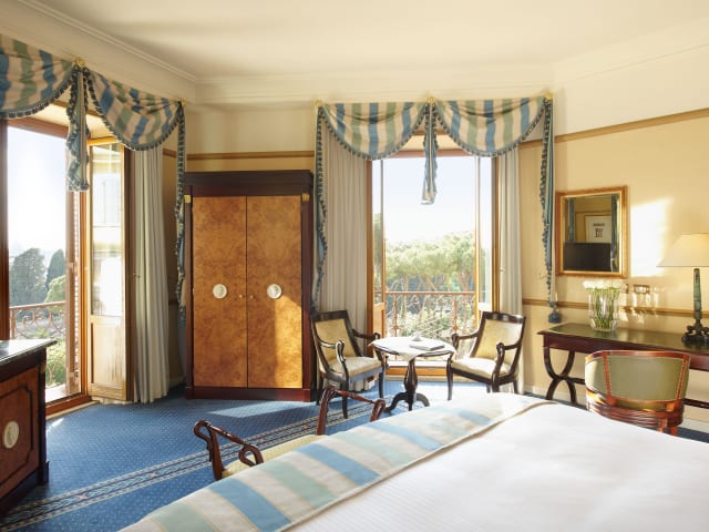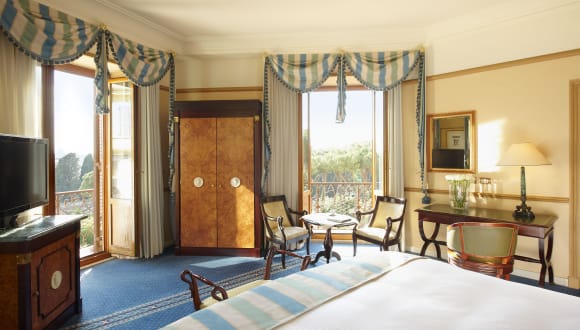 Das Hotel bietet verschiedene Zimmerkategorien, darunter Doppelzimmer und Suiten, alle ausgestattet mit luxuriösen Annehmlichkeiten. Die Zimmer verfügen über eine Klimaanlage, einen Safe, eine Kaffeemaschine und eine Minibar. Die Badezimmer sind mit hochwertigen Pflegeprodukten ausgestattet. Einige Zimmer bieten einen Blick auf die Stadt oder die Gärten. Die letzte komplette Renovierung der Zimmer hat 2019 stattgefunden.