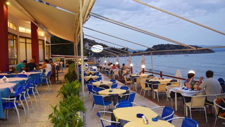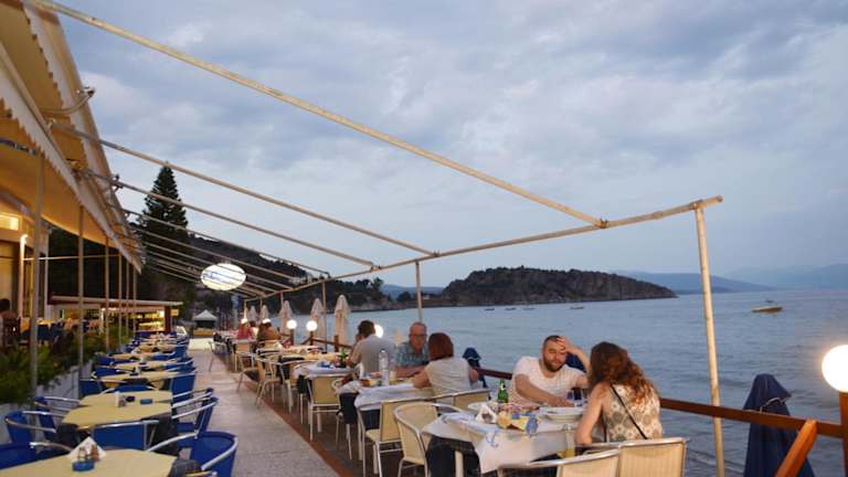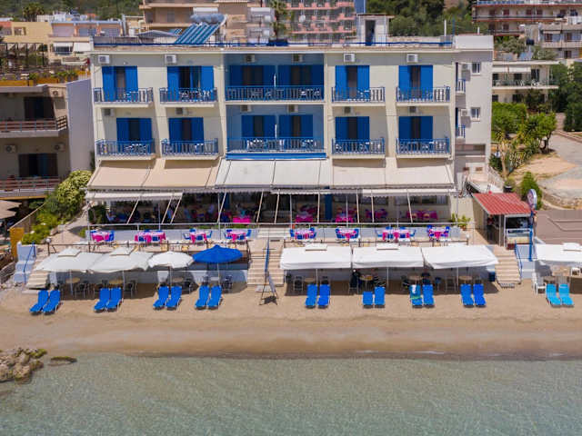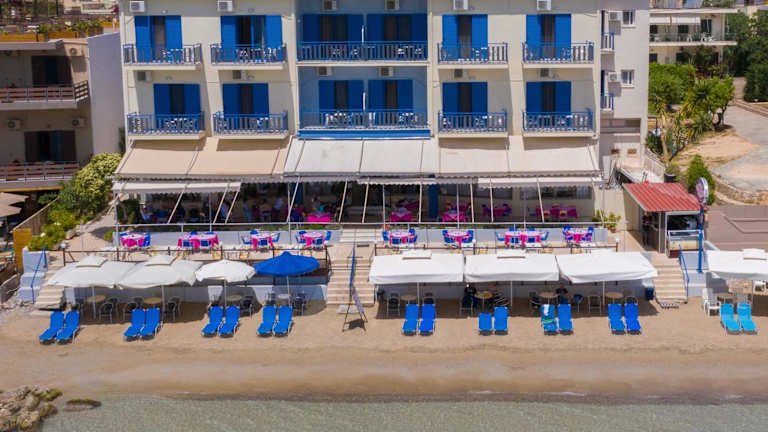 Morgens wird ein Frühstücksbuffet bereitgestellt. Zum Mittag- und Abendessen können Gäste im Restaurant aus einer Auswahl an griechischen Gerichten wählen, die auch im Freien genossen werden können. Die Bar bietet Kaffee und weitere Getränke.