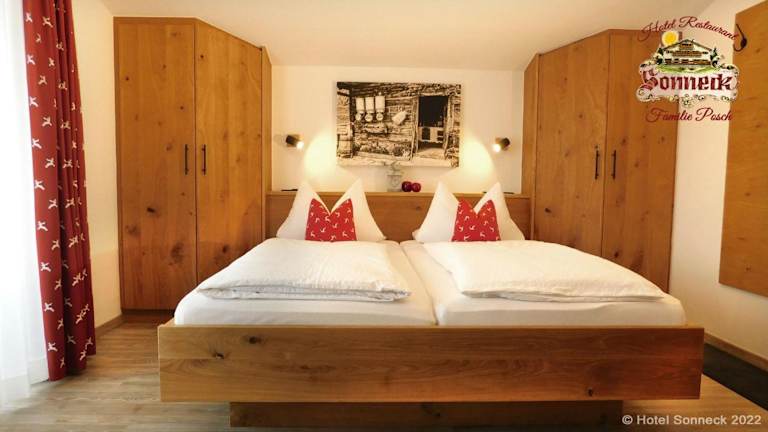 Die Zimmer im Hotel-Gasthof-Sonneck sind gemütlich und komfortabel eingerichtet. Sie verfügen über einen Kleiderschrank, einen Flachbild-TV und ein eigenes Bad. Jedes Zimmer bietet zudem einen Balkon mit herrlichem Blick auf die umliegenden Berge. Die Gäste können sich hier entspannen und den Aufenthalt in vollen Zügen genießen.