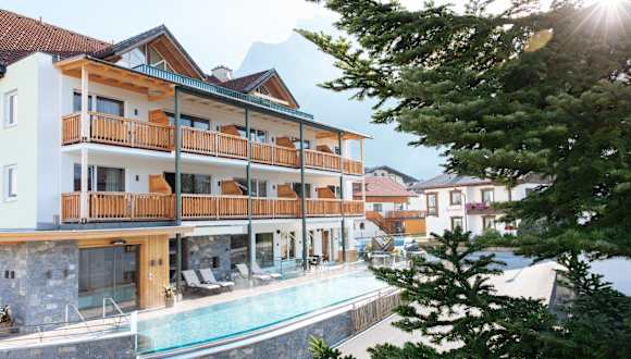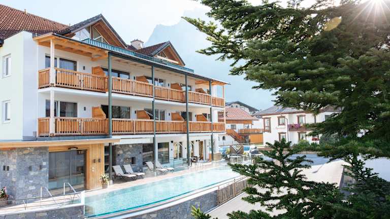 Kulinarik & Wellness im Hotel Sonnenspitze an der Tiroler Zugspitze Erleben Sie Genuss und Entspannung im zentral, aber dennoch ruhig gelegenen Hotel in Ehrwalds Ortsmitte: Die Sonnenspitze-Verwöhnpension, unser Wellnessbereich mit beheiztem Aussenpool, Biosauna, Dampf- & Kräuterbad, grosszügigem und einladendem Ruhebereich und die Sonnenterrassen sorgen für beste Urlaubslaune.