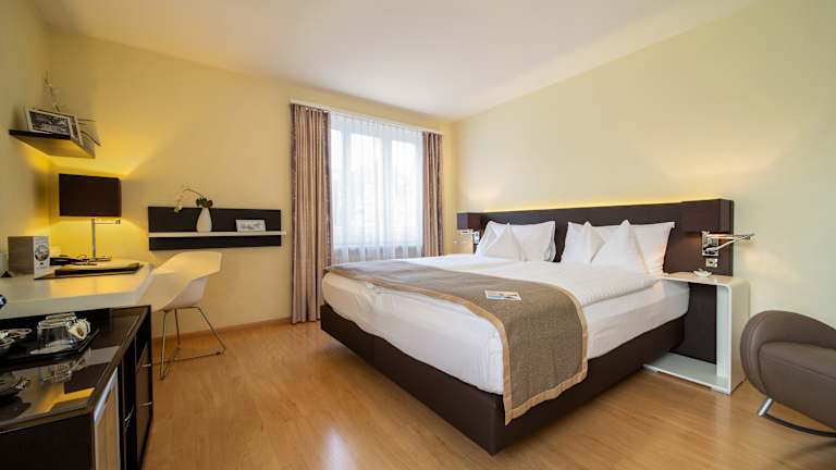 Sie übernachten in stilvollen und modernen Zimmern mit grossem Schreibtisch, bequemem Schaukelstuhl oder Sofa mit Flachbildschirm-TV, Minibar, Kaffeemaschine und Teekocher.