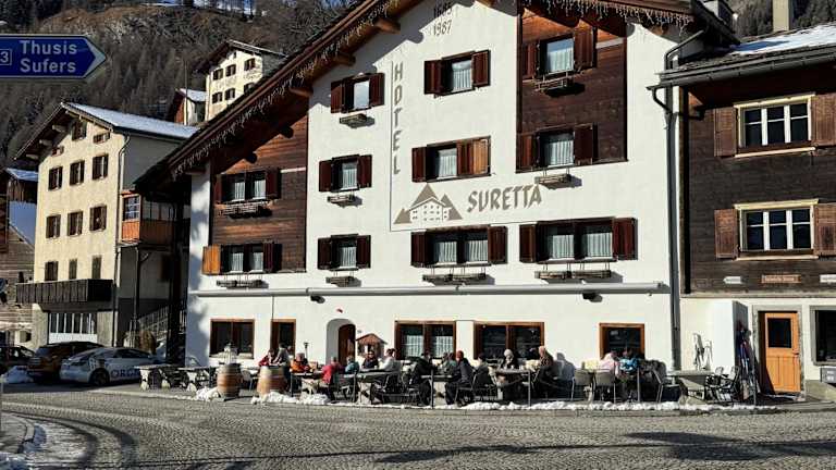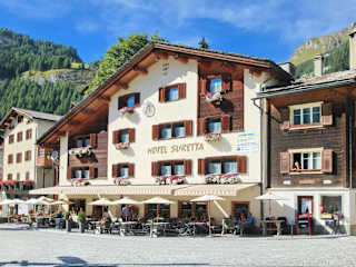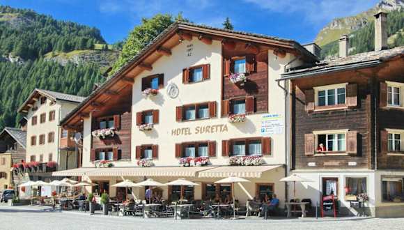 Das Hotel Suretta befindet sich im Zentrum von Splügen, direkt neben dem Hinterrhein. Die Autobahnausfahrt Splügen der A 13 ist nur 500 m entfernt, und nach einer 15-minütigen Autofahrt erreichen Sie das Thermalbad Andeer.