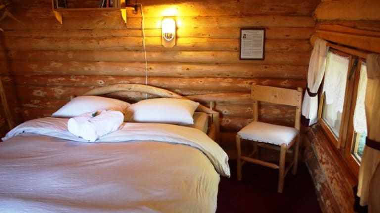 Unsere Gaeste wohnen in privaten, handgebauten Blockhauscabins, ausgestattet mit jeweils einem Queen- oder zwei Twinsizebetten, einer Waschgelegenheit, portabler Toilette und Solarlicht.