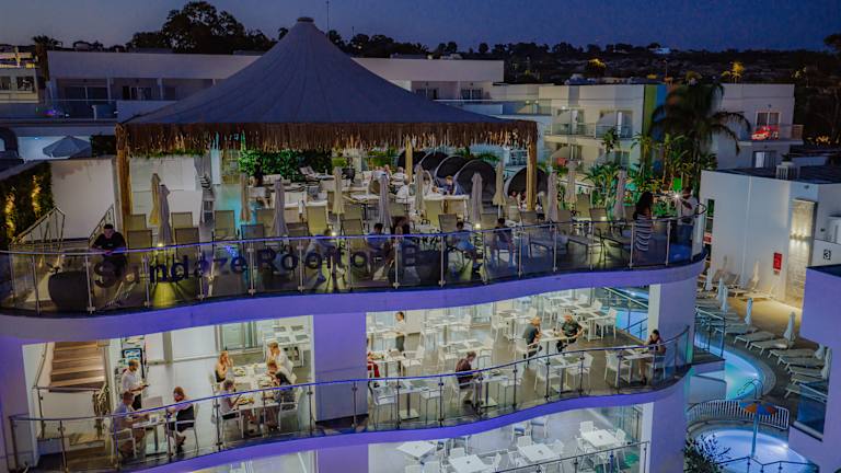 The main restaurant offers breakfast and dinner - buffet style dining. In addition to that, the Pool Bar, offers a wide range of snacks, drinks, Shisha and a selection of signature cocktails served all-day. The Roof Top Bar offering stunning views operates from June to September.