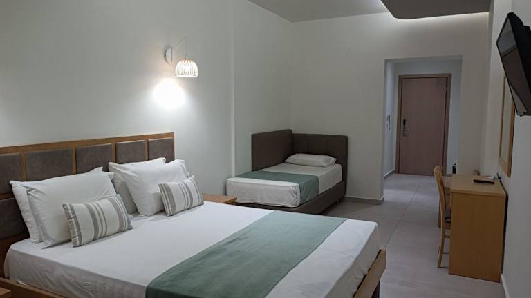 Morgens stärken sich die Gäste mit einem kontinentalen Frühstück im Speisebereich. In der Strandbar können leichte Snacks, Getränke und Kaffee genossen werden. Das Hotelrestaurant serviert mittags und abends griechische sowie mediterrane Küche.