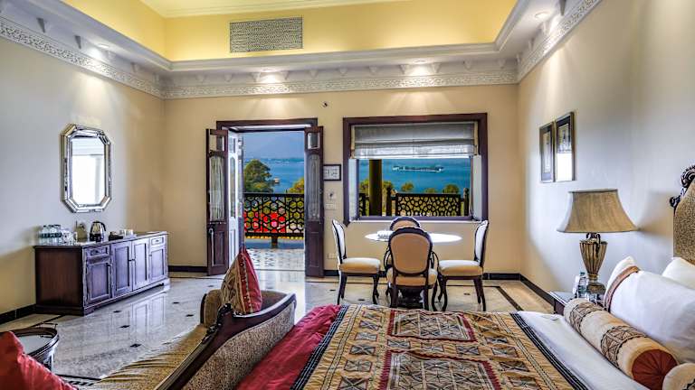 Das Hotel beherbergt mehrere Restaurants: Das Aangan serviert indische und kontinentale Gerichte mit Blick auf den Sajjangarh-Palast, während das Padmini rund um die Uhr multikulturelle Küche anbietet. Der Garden Grill bietet Grillspezialitäten und eine Auswahl an erlesenen Weinen. Frühstück und Abendessen werden in Buffetform angeboten, und auf Wunsch werden auch spezielle Diätgerichte und Kindermenüs zubereitet.