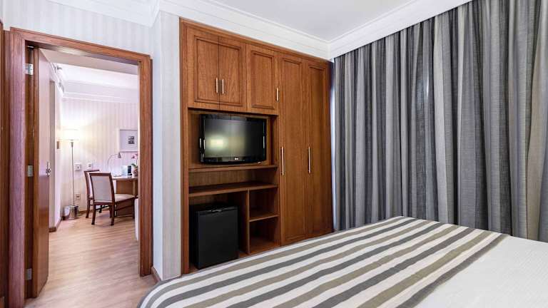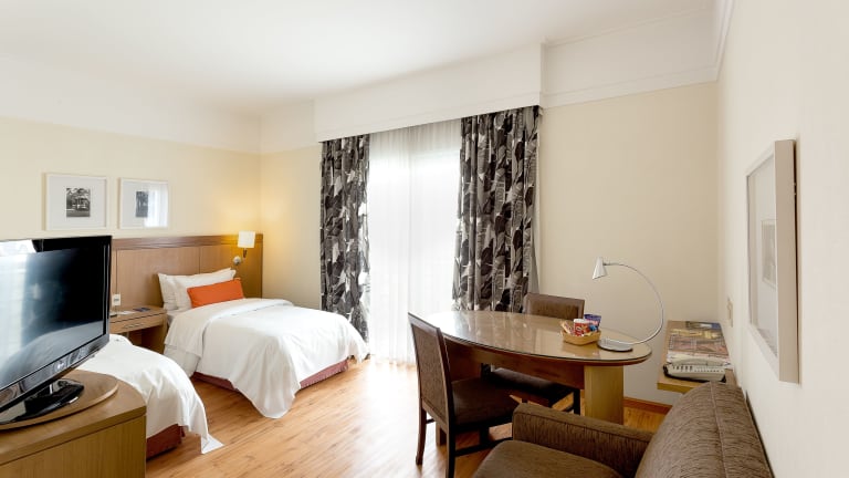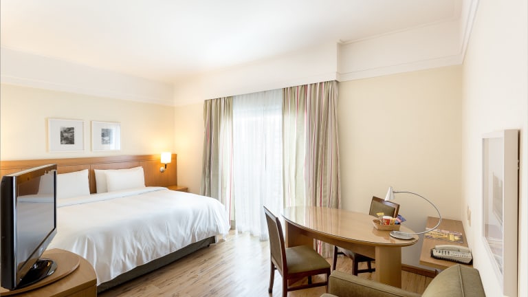 In den Zimmern sorgt eine individuell steuerbare Klimaanlage für ein angenehmes Raumklima. Sie sind mit Teppichböden ausgestattet und verfügen über ein Doppelbett, ein Queensize-Bett oder ein Kingsize-Bett. Zustellbetten können angefordert werden. Jedes Zimmer ist mit einem Safe, einer Minibar, einer Tee-/Kaffeemaschine und einem Bügelset ausgestattet. Zur Unterhaltung stehen ein Telefon mit Direktwahl, ein TV-Gerät mit Satelliten-/Kabelempfang, ein Radio, eine Stereoanlage sowie kostenfreies Wifi zur Verfügung. Die Badezimmer sind mit einer Dusche, einer Badewanne, einem Haartrockner und einem Telefon ausgestattet. Auch rollstuhlgerechte Zimmer sind verfügbar.