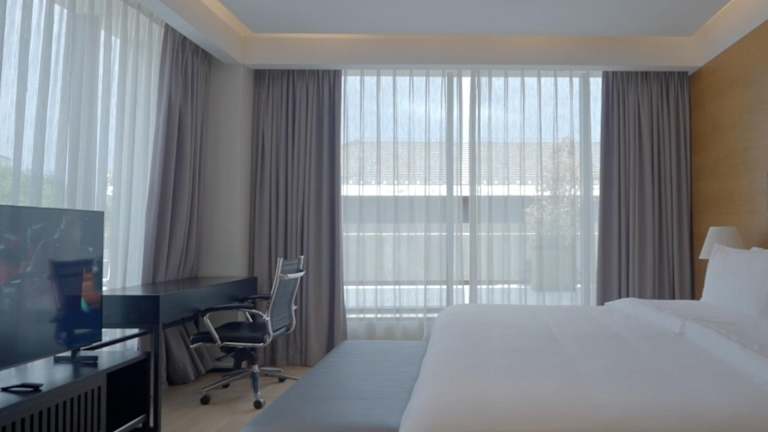 Die Zimmer sind klimatisiert und ausgestattet mit Teppichböden, bequemen Betten (Doppelbett, Queensize-Bett oder Kingsize-Bett), Safe, Minibar und Schreibtisch. Eine Tee-/Kaffeemaschine sowie ein TV-Gerät und Wifi stehen zur Verfügung. In den Badezimmern gibt es entweder eine Dusche oder eine Badewanne, Haartrockner und Bademäntel. Barrierefreie Zimmer sind verfügbar.