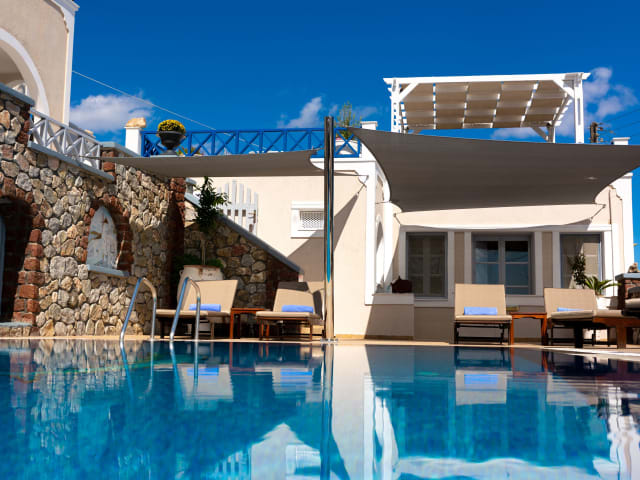 Das Hotel Thira bietet komfortable Einrichtungen und alle Unterkünfte sind mit modernen Annehmlichkeiten ausgestattet, die einen erholsamen Ferienaufenthalt gewährleisten. Die Zimmer sind im traditionellen Stil der Insel gestaltet und verfügen über einen Balkon oder eine Terrasse mit beeindruckendem Blick auf das Meer und die Umgebung. Entspannung findet man am Aussenpool mit herrlichem Meerblick.