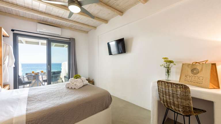 Das Hotel To Kyma bietet geschmackvoll eingerichtete Studios und Apartments zur Selbstverpflegung, die mit Klimaanlage, einem Balkon sowie einer Küchenzeile mit Minikühlschrank ausgestattet sind. WLAN steht in allen Bereichen kostenfrei zur Verfügung. Die Reinigung sowie der Wechsel der Bettwäsche und Handtücher erfolgt täglich. Es werden Informationen zur Umgebung und Mietwagen angeboten. Himmlische Momente können beim hausgemachten Frühstück auf dem Balkon genossen werden.