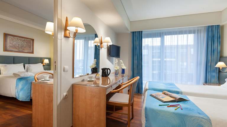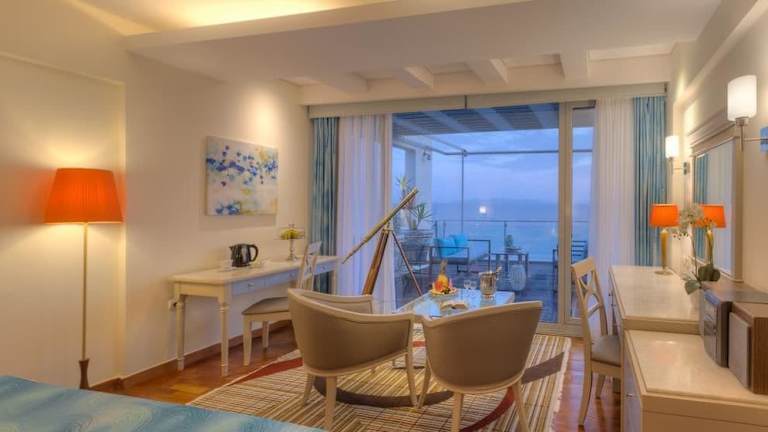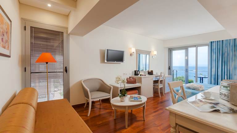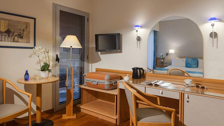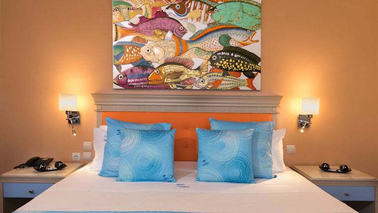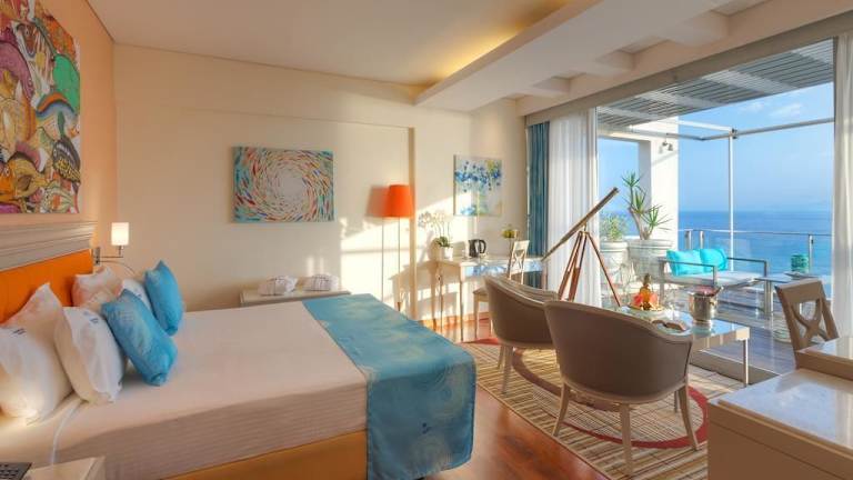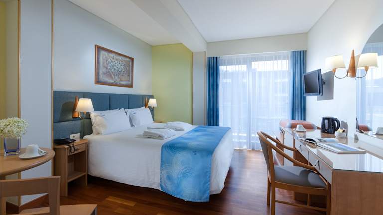 Die Zimmer sind klimatisiert und verfügen über eine Heizung, einen Balkon oder eine Terrasse, die meisten haben Meerblick. Sie sind mit einem Kingsizebett, einem Sofabett, einer Minibar, einem TV-Gerät mit Satelliten-/Kabelempfang sowie kostenfreiem WLAN ausgestattet. Im Badezimmer finden sich eine Dusche, ein Haartrockner und ein Telefon. Es gibt auch rollstuhlgerechte Zimmer mit barrierefreiem Bad.
