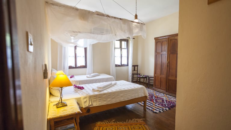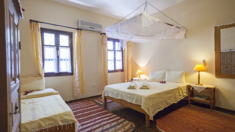 All rooms have air conditioning and bathrooms. The Family suite has 2 rooms with a joint bathroom. All rooms are non-smoking. We have 9 rooms in total including The Family Suit, 2 superior doubles, a tripple and 4 doubles one of which has twin beds. The double rooms can also be used as a single. All rooms have different characters with local and traditional textiles as a main feature. The old Turkish village house was restored and enlarged to accommodate travellers since 1988.