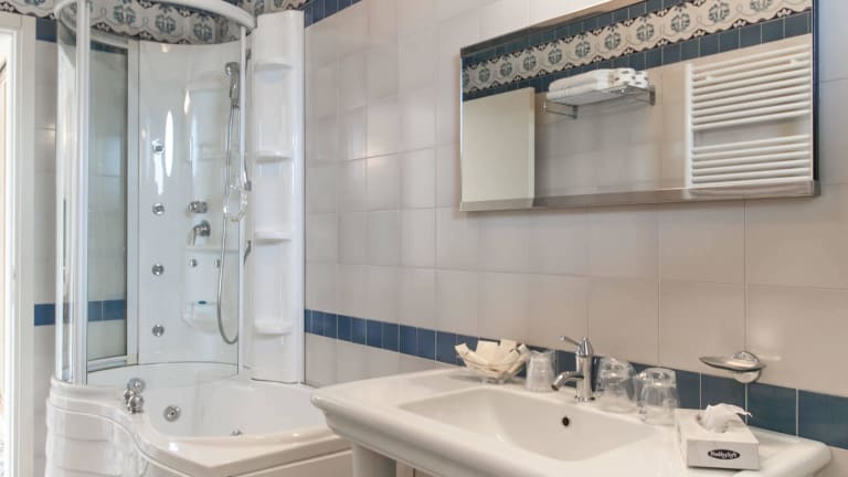 Die Zimmer vom Hotel Universal bieten einen unbezahlbaren Blick auf die Adria oder auf den eleganten Pool, sie sind hell und gemütlich und zweckmäßig in zarten rosa Tönen eingerichtet.