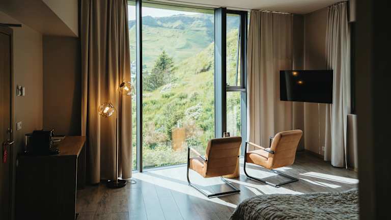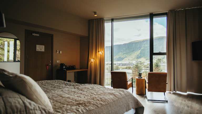 Die Zimmer im Hotel Vík í Mýrdal sind ausgestattet mit einem Schreibtisch, einem Flachbild-TV, einem eigenen Badezimmer, Bettwäsche und Handtüchern. Zudem stehen den Gästen ein Kleiderschrank und ein Wasserkocher zur Verfügung.
