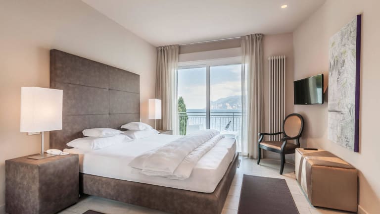 Zimmer & Suiten • Helle und komfortable Zimmer mit Blick auf den Gardasee • Flauschige Bademäntel, Badetücher und Strandtasche • Flachbildschirm • Safe • Minibar • Klimaanlage • Highspeed-WLAN