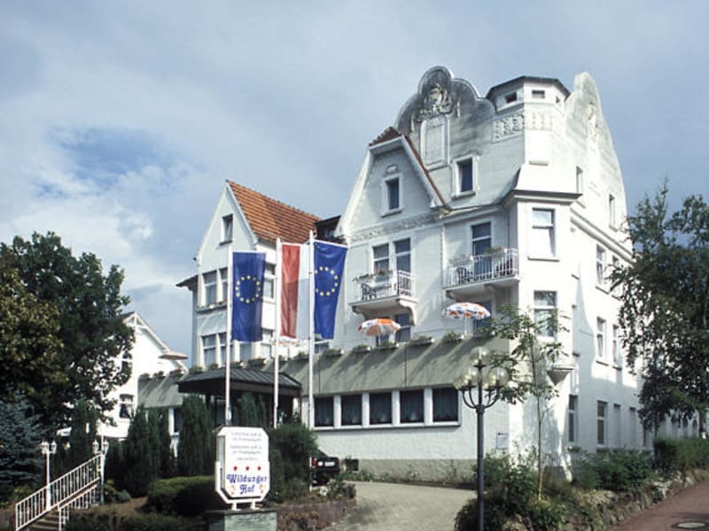 Das Hotel Wildunger Hof hat eine Fassade im Jugendstil und bietet eine luxuriöse Villa mit 60 Betten. Es verfügt über voll ausgestattete Gemeinschaftsküchen auf jeder Etage und bietet eine gemütliche Atmosphäre.