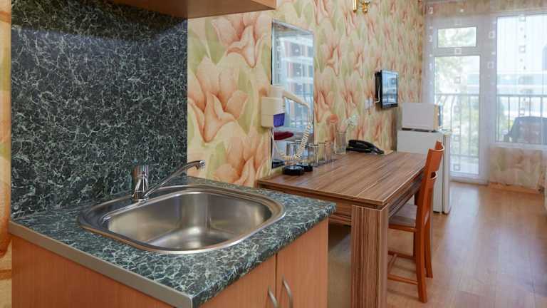 Das Hotel verfügt über ein Restaurant, ein Café und eine Bar, die bulgarische sowie europäische Küche anbieten. Gäste können zwischen Halbpension und All-Inclusive wählen, wobei verschiedene Mahlzeiten wie Frühstück, Mittagessen und Abendessen erhältlich sind. Auf Wunsch werden Diätgerichte und Kindermenüs zubereitet.