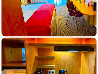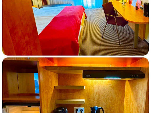 Das Hotelzimmer bietet eine moderne und gemütliche Atmosphäre mit einem eigenen Eingangsbereich. Es besteht aus einem Schlafzimmer und einem Badezimmer mit Dusche. Die Zimmer verfügen über eine Klimaanlage, kostenlosen WLAN-Zugang, einen Satelliten Flachbild-TV mit Streaming-Diensten sowie eine voll ausgestattete Küche.