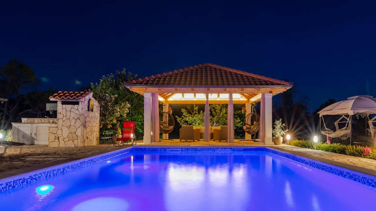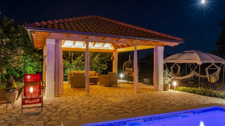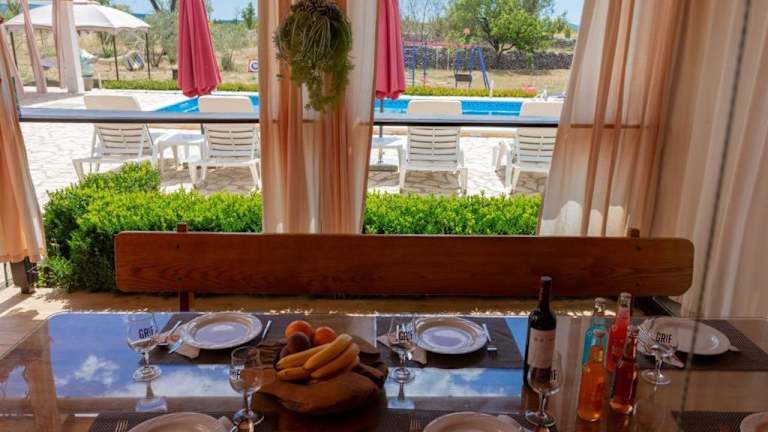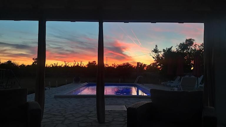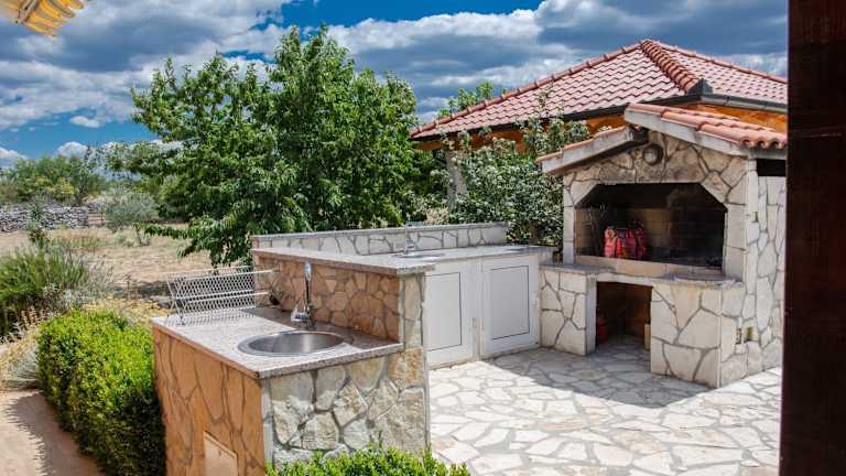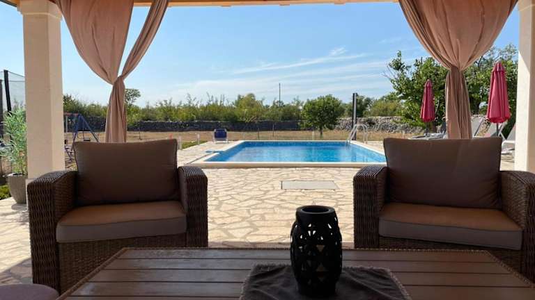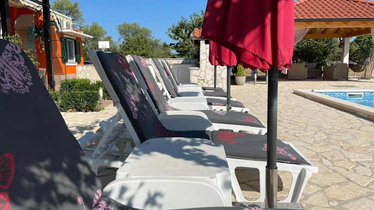 Das Ferienhaus House vacation with pool, near Šibenik bietet Übernachtungsmöglichkeiten mit Blick auf den eigenen Pool und eine einladende Veranda. Die Unterkunft ist umgeben von einem Garten und verfügt über einen Grillbereich.
