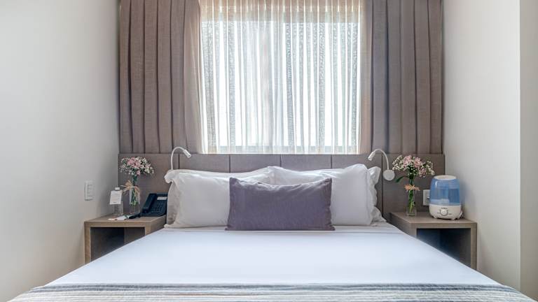 Die Zimmer sind mit einem Doppelbett und einem Sofabett ausgestattet. Zustellbetten können angefordert werden. Zur Ausstattung gehören eine Minibar, Sat-TV und WLAN, während in den Badezimmern ein Haartrockner bereitsteht. Einige Zimmer bieten zudem einen Balkon oder einen Blick auf die Stadt.