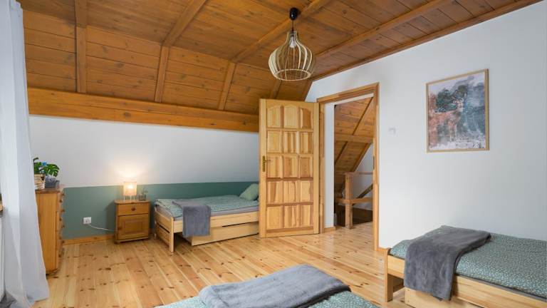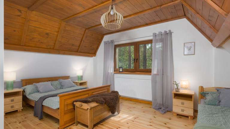 Hubertówka domek murowany bietet Unterkünfte mit Balkon und kostenlosem WLAN in einem Ferienhaus, das über zwei Schlafzimmer, ein Wohnzimmer, eine voll ausgestattete Küche sowie ein Badezimmer mit Wanne oder Dusche und Haartrockner verfügt. Handtücher und Bettwäsche sind in der Unterkunft vorhanden.