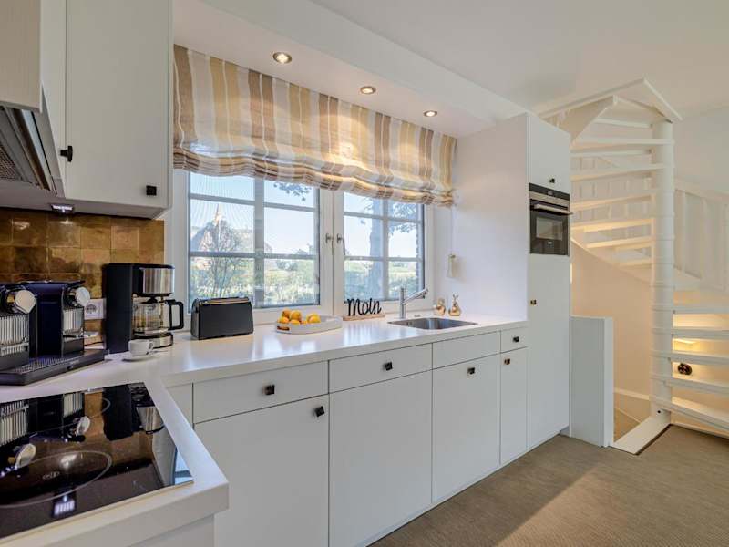 Die Ferienwohnung ist mit einer voll ausgestatteten Küche versehen, die einen Kühlschrank, Geschirrspüler, Waschmaschine, Ofen und Herdplatte umfasst. Handtücher und Bettwäsche werden den Gästen zur Verfügung gestellt.