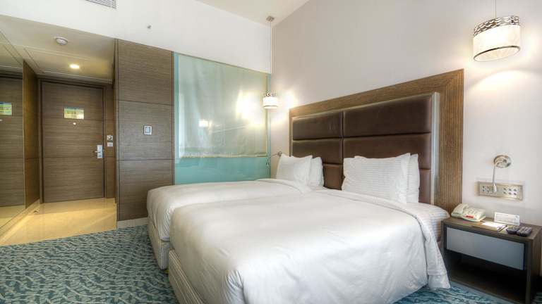 Die Zimmer sind mit einem Wohnbereich, einer Klimaanlage, einem Badezimmer mit Dusche, einem Haartrockner, einem Fernseher und einer Minibar ausgestattet. Zusätzlich bieten die Zimmer einen Safe, einen Kühlschrank sowie eine Tee-/Kaffeemaschine. Für Familien werden geeignete Zimmer angeboten, inklusive Nichtraucher- und Raucherzimmer.