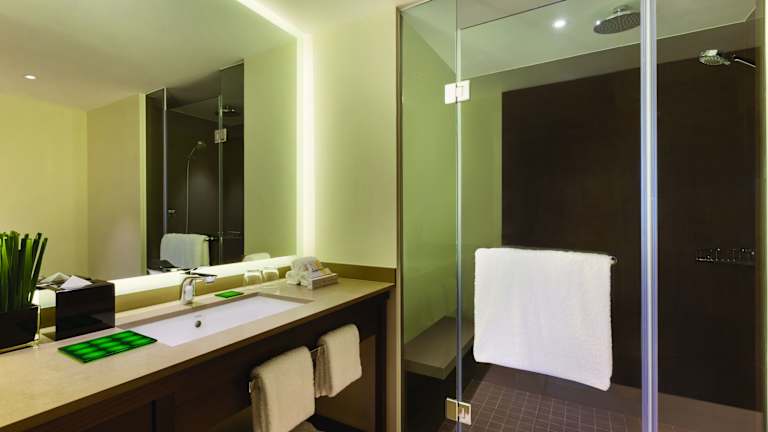 Die klimatisierten Zimmer sind mit einem Kühlschrank, einem Wasserkocher, einem Flachbild-Sat-TV und einem Safe ausgestattet. In jedem Zimmer gibt es ein eigenes Bad mit weichen Bademänteln und einer Dusche. Einige Zimmer verfügen über einen zusätzlichen Wohnbereich. Zudem können rollstuhlgerechte Zimmer gebucht werden. Die Zimmer bieten zusätzlich Internetzugang über Wifi, einen Schreibtisch und eine Tee-/Kaffeemaschine.