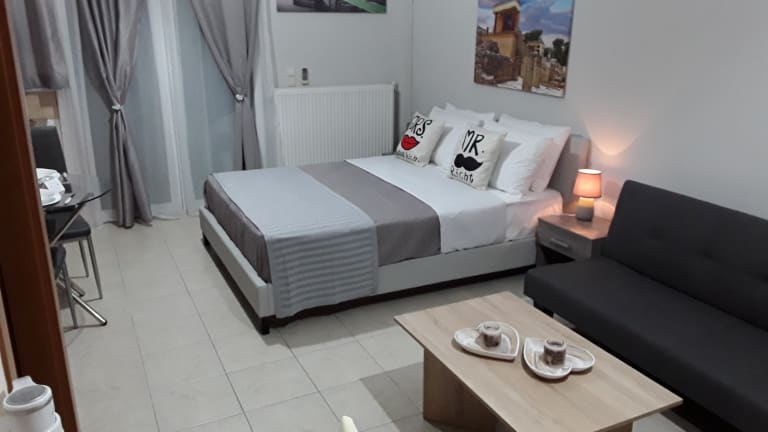 Ierapetra Suites & Studios is located in the town of Ierapetra, 800 meters from the center. It offers air-conditioned accommodation with free wi-fi and a terrace. All apartments feature tiled floors, a fully equipped kitchen with fridge, flat-screen TV and a private bathroom with shower and washing machine. They also include a stove, a kettle and a coffee maker. Junior Suite-Full equipment (all included): -Parking (Free street parking), -Internet( Free WiFi), -Kitchen (Freedom to eat whenever you want, Wine glasses, Dining table, Coffee machine, Stovetop, Oven, Kitchenware, Electric kettle,Refrigerator), -Bedroom (XL Wardrobe,Double Bed,Bedside tables,Socket near the bed,Sofa bed,floor with tile, iron, ironing board ), -Bathroom(Private bathroom,Shower,Washing machine,hairdryer,Toilet paper,Linens,Toilet), -Living Area(Dining area,Sofa,Sitting area,Desk), -Media & Technology(Flat-screen TV), -Outdoors(Outdoor furniture,Outdoor dining area,Sun deck,Patio,Balcony,Terrace,Garden), -Food & Drink(Electric Cooker, Coffee maker, Boiler, Kitchen Utensils), -Building Characteristics(Private apartment in building), -Outdoor & View( Quiet street view, Courtyard view, Garden view), -Front Desk Services (Baggage storage,Express check-in/out, 24-hour front desk), -Miscellaneous(Air conditioning, Soundproof room), -Safety & Security(Closed-circuit security cameras outside property,Closed-circuit security cameras in common areas)