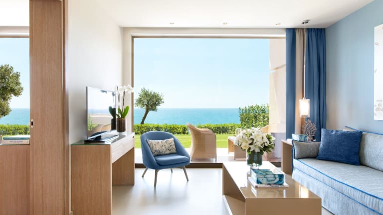 ERSTER EINDRUCK Idyllische Lage und Erholung pur – hier zeigt sich die Ägäis in ihrer ganzen Pracht und berauscht Ihre Sinne: Die terrassenförmig angelegten Gärten schmiegen sich sanft bis hinunter zum Privatstrand. Von Ihrem Balkon hören Sie die Wellen rauschen, in der Dunkelheit verzaubert Sie ein Lichtspiel funkelnder Boote am Horizont. Genießen Sie die unendlichen Möglichkeiten. Hier stimmt einfach alles:Vom Service bis hin zu nobel präsentierten kleinen Aufmerksamkeiten.