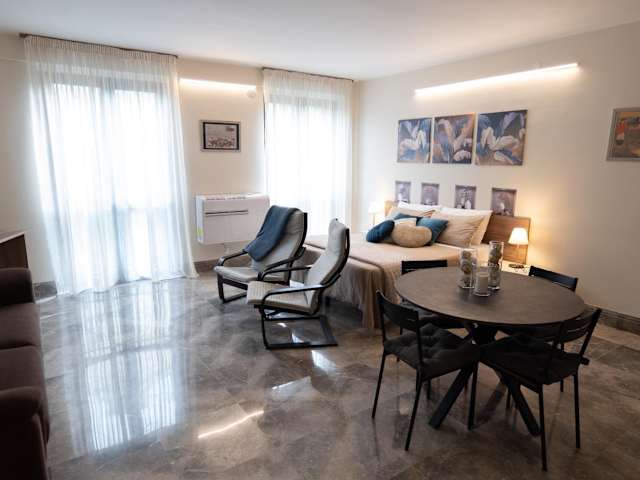 Die Wohnung verfügt über ein Schlafzimmer und ein Badezimmer, ausgestattet mit einem Bidet, einer Dusche sowie kostenlosen Pflegeprodukten. Zudem wartet die Küche mit einem Kühlschrank, einer Mikrowelle, einer Herdplatte, einer Kaffeemaschine und einem Wasserkocher auf. Eine Klimaanlage sorgt für angenehme Bequemlichkeit.