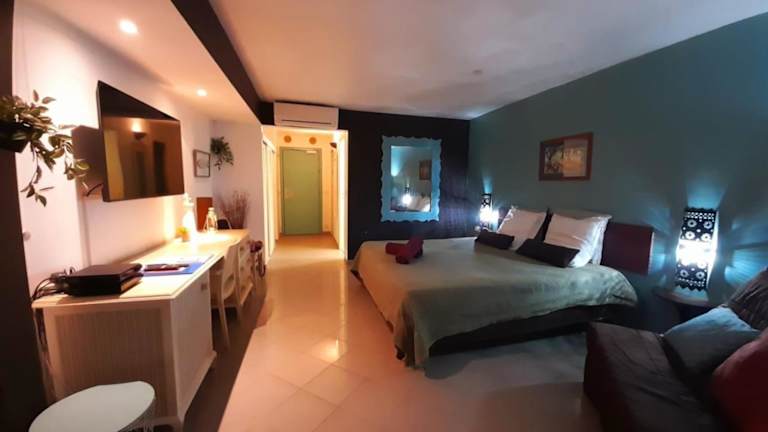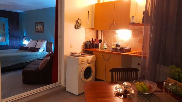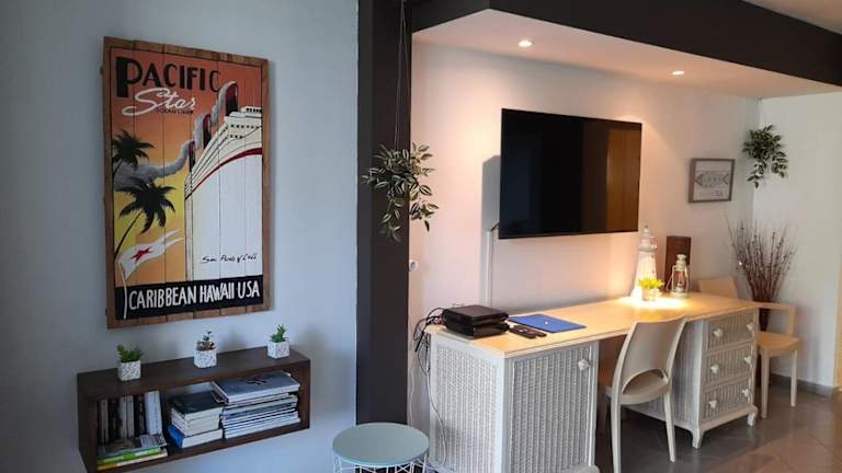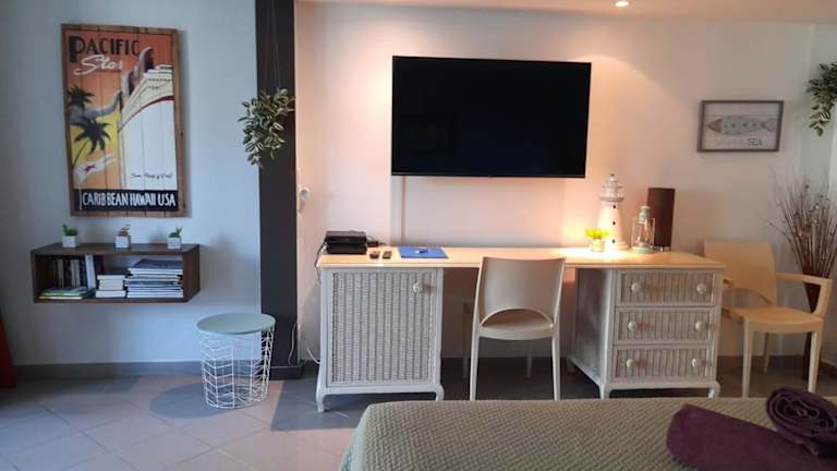 Das Studio verfügt über ein Schlafzimmer und ein Badezimmer. Zur gemütlichen Ausstattung gehören Bettwäsche und Handtücher, ein Flachbild-TV, ein Essbereich sowie eine voll ausgestattete Küchenzeile. Eine Terrasse mit Meerblick ergänzt das Angebot.