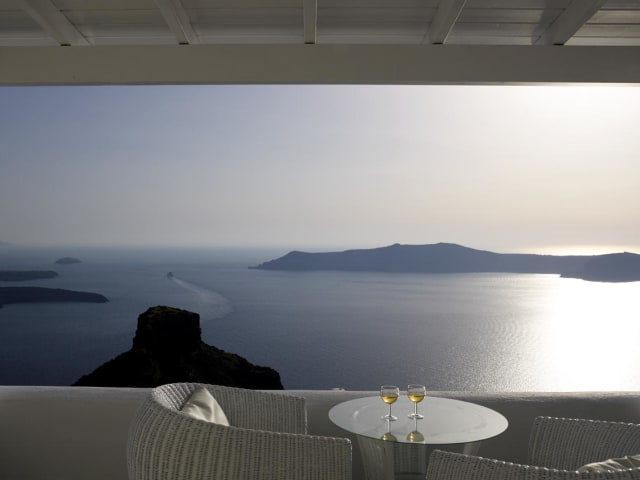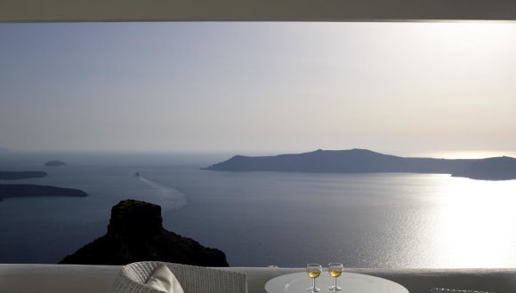 Das Hotel liegt ruhig und direkt am Kraterrand, etwa 2 km von Fira entfernt. Von hier aus können Sie entlang des schönsten Wanderwegs der Kykladen nach Fira spazieren. Die Lage des Hotels, 360 m über dem Meeresspiegel, bietet einen spektakulären Blick auf die Caldera.
