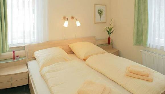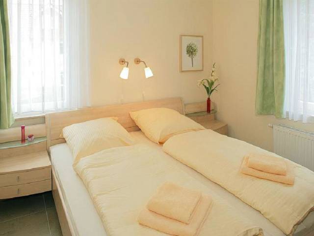 Die Ferienwohnung besteht aus 2 separaten Schlafzimmern und einer voll ausgestatteten Küchenzeile, die mit einem Kühlschrank und einem Geschirrspüler ausgestattet ist. Ein Badezimmer ist ebenfalls vorhanden.