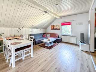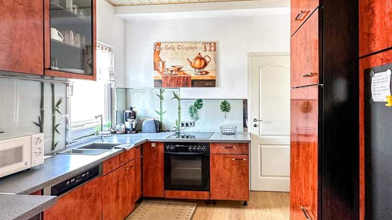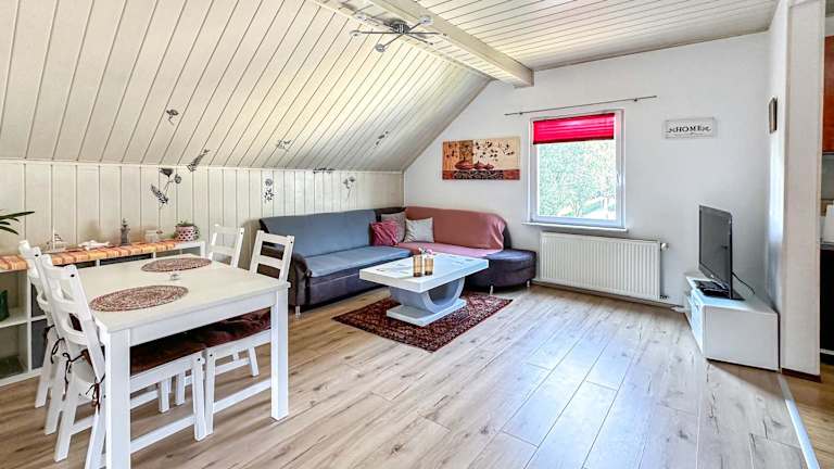 Die Wohnung ist ausgestattet mit einem Wohnzimmer, einer voll ausgestatteten Küche und einem Badezimmer.