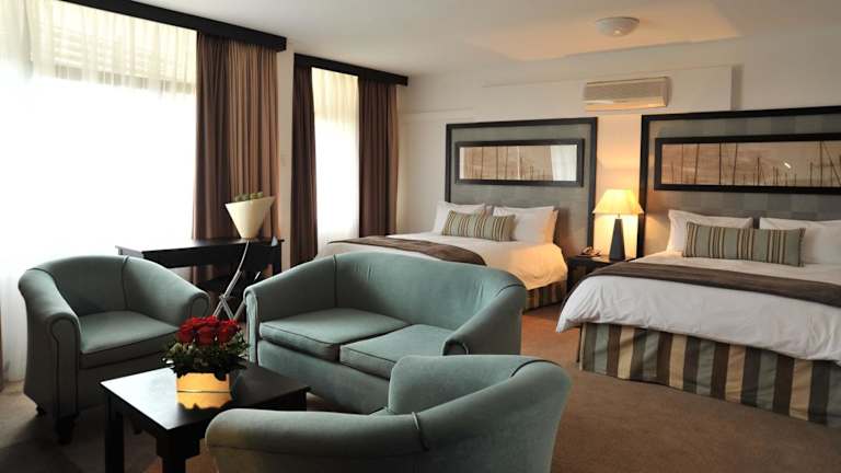 Die Zimmer sind klimatisiert und verfügen über ein Doppelbett, ein Queensize-Bett oder ein Kingsize-Bett. Zustellbetten können angefordert werden. Zur Ausstattung gehören ein Safe, ein Schreibtisch, ein Kühlschrank, eine Tee-/Kaffeemaschine und Sat-TV. Die Badezimmer sind mit einer Dusche und einer Badewanne ausgestattet.