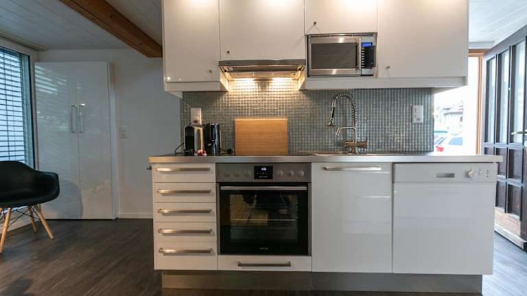Die Unterkunft verfügt über eine voll ausgestattete Küche, die einen Kühlschrank, einen Geschirrspüler, einen Ofen, eine Herdplatte sowie eine Kaffeemaschine und einen Wasserkocher umfasst.