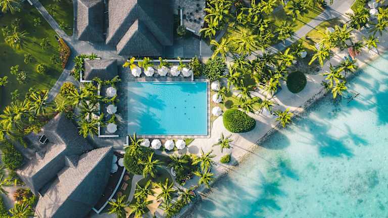 Direkt am Sandstrand der 'Motu Piti Aau' an der östlichen Seite von Bora Bora gelegen, befindet sich das Resort inmitten der Natur. Die Entfernung zum Flughafen Bora Bora beträgt ca. 11 km, was einer Fahrzeit von etwa 20 Minuten entspricht. Das Stadtzentrum von Vaitape ist ca. 5 km entfernt, ebenfalls in etwa 20 Minuten erreichbar.