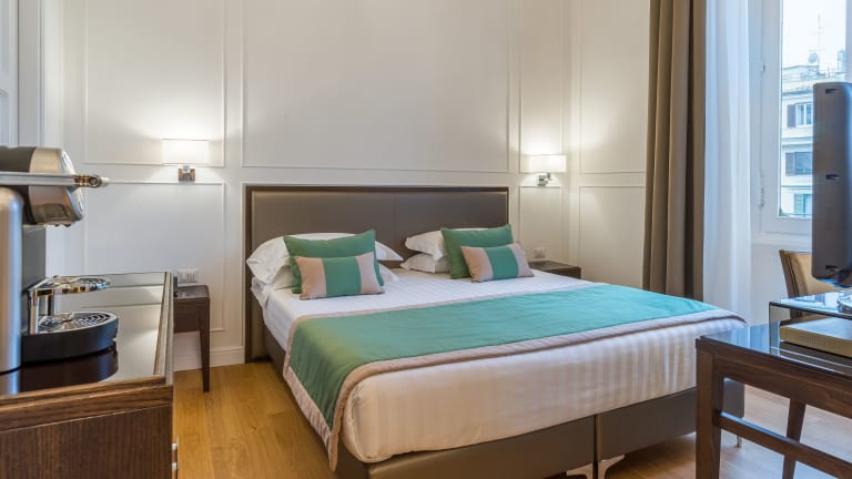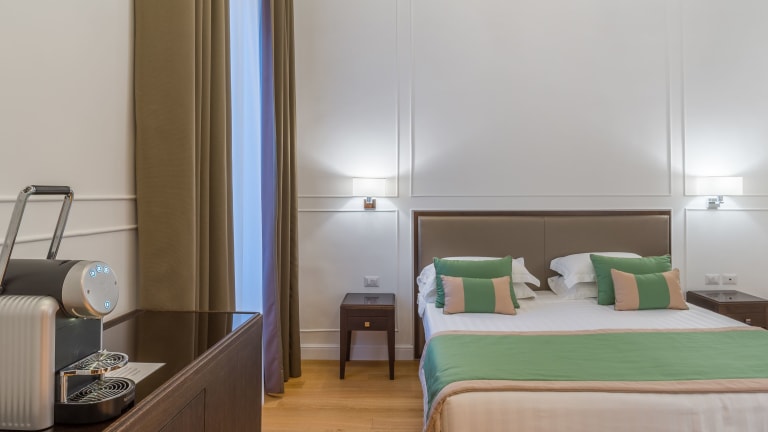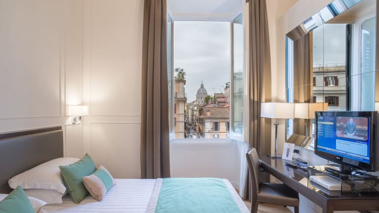 Die Zimmer im Internazionale Domus sind bestens ausgestattet und bieten eine angenehme Bequemlichkeit. Zur Ausstattung gehören ein LCD-TV, Klimaanlage, Hausschuhe sowie Zapfen zum Tee und Kaffee. Es stehen auch kostenlose Snacks bereit.