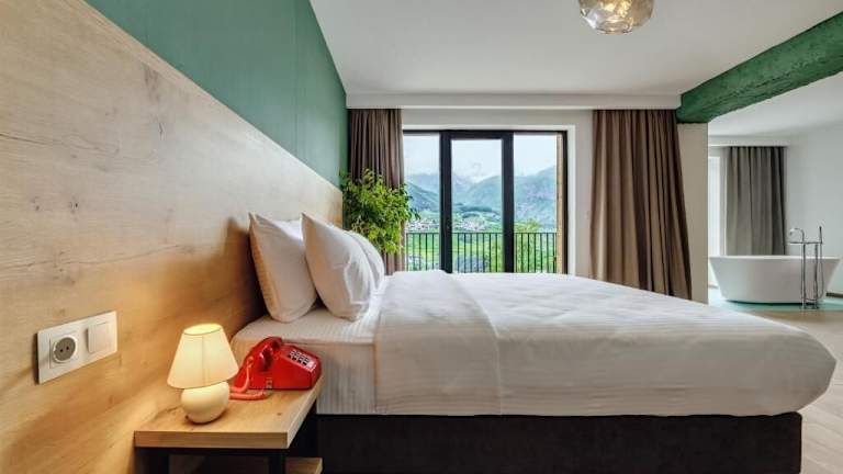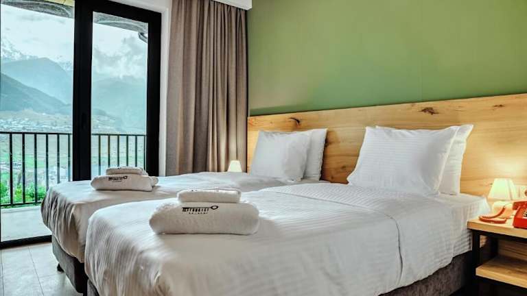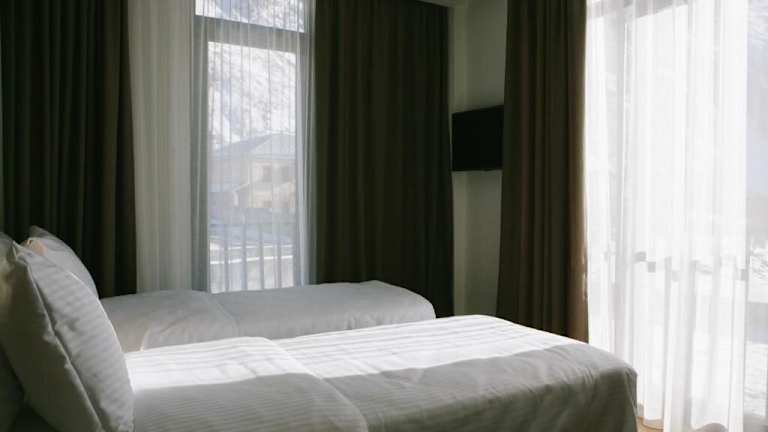 Die Zimmer im Intourist Kazbegi sind heimelig eingerichtet und bieten ein angenehm temperiertes Raumklima. Die Gäste können zwischen einem Queensize-Bett oder einem Kingsize-Bett wählen. Jedes Zimmer ist mit einem Schreibtisch, einem Safe, einer Minibar, einem TV-Gerät mit Satelliten-/Kabelempfang, kostenlosem Wifi sowie Hausschuhe ausgestattet. Im Badezimmer stehen den Gästen ein Haartrockner, Bademäntel und Kosmetikartikel zur Verfügung. Einige Zimmer haben zudem einen Balkon oder bieten einen Blick auf den Garten.