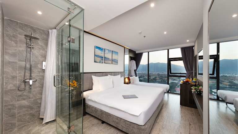 Die Zimmer im Ivy Hotel Nha Trang sind klimatisiert und bieten einen Sitzbereich sowie Meerblick. Jedes Zimmer verfügt über ein Queensizebett, ein Sofabett, einen Safe, eine Minibar und einen Schreibtisch. Eine Tee-/Kaffeemaschine, eine Hosenpresse und ein TV-Gerät sind ebenfalls vorhanden. Die Badezimmer sind mit einer Dusche, einem Haartrockner und kostenlosen Pflegeprodukten ausgestattet. Hausschuhe und eine Auswahl an Handtüchern stehen den Gästen zur Verfügung. Family- und Nichtraucherzimmer sind ebenfalls verfügbar.