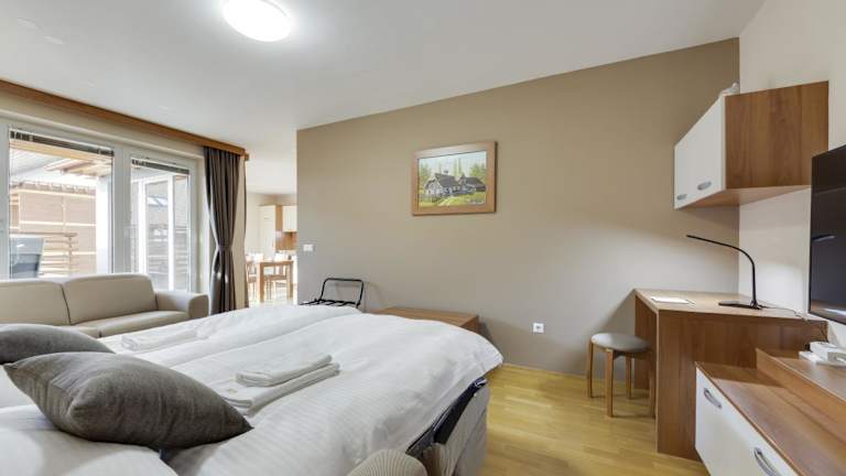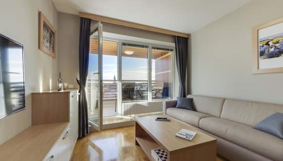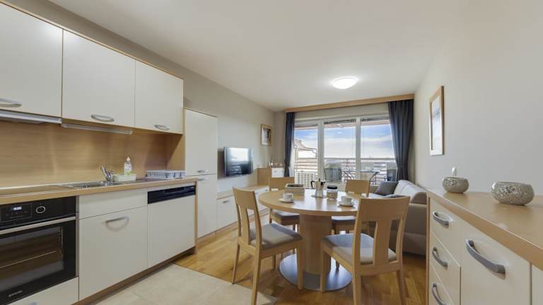 Die Wohneinheiten sind komfortabel ausgestattet und verfügen über einen Sitzbereich, einen Satelliten Flachbild-TV und eine voll ausgestattete Küche mit Kühlschrank, Geschirrspüler, Ofen, Toaster und Wasserkocher. Ein eigenes Badezimmer mit Dusche und kostenlosen Pflegeprodukten rundet das Angebot ab.