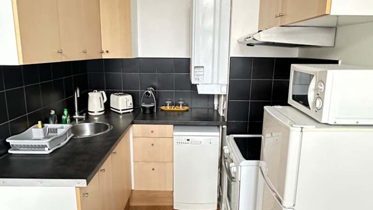 Die Ferienwohnung besteht aus einem Schlafzimmer, einem Wohnzimmer und einer voll ausgestatteten Küche, die mit einem Kühlschrank und einer Kaffeemaschine ausgestattet ist. Zudem gibt es ein Badezimmer mit einer Dusche und einem Haartrockner. Ein Flachbild-TV ergänzt die Ausstattung.
