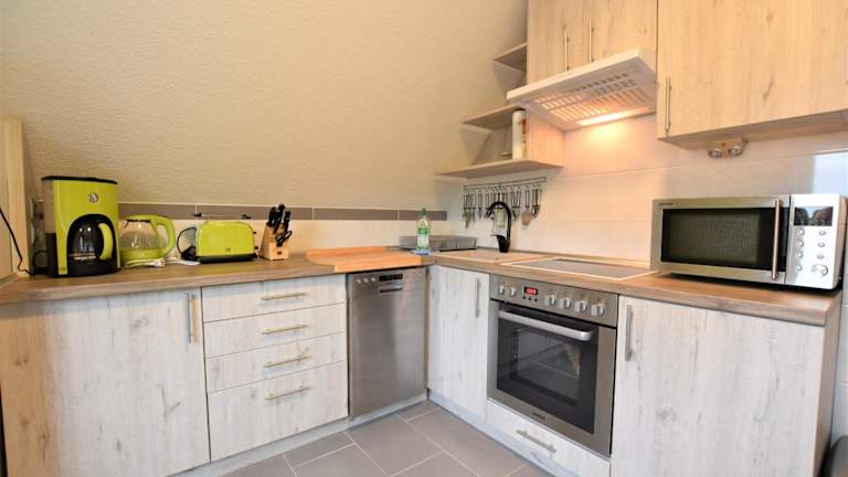 Die Ferienwohnung verfügt über eine gut ausgestattete Küche mit Kühlschrank und Geschirrspüler, die es den Gästen ermöglicht, eigene Mahlzeiten zuzubereiten. In der Umgebung sind verschiedene Restaurants zu finden.