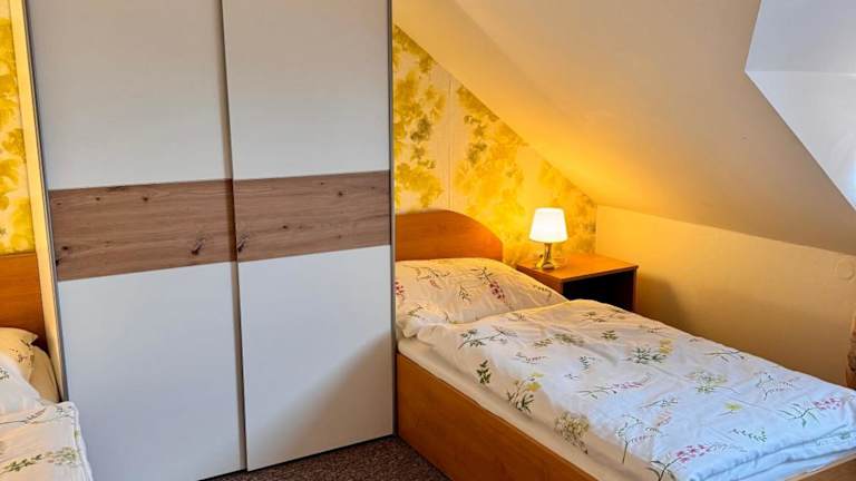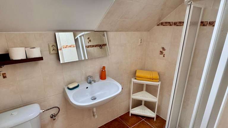 Die Ferienwohnung verfügt über drei Schlafzimmer, eine Küchenzeile mit Kühlschrank und Mikrowelle sowie zwei Badezimmer mit Dusche und Haartrockner. Handtücher und Bettwäsche werden bereitgestellt.