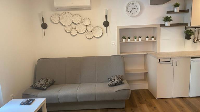 Die Ferienwohnung besteht aus einem Schlafzimmer, einem Wohnzimmer und einer voll ausgestatteten Küche mit Kühlschrank und Wasserkocher. Das Badezimmer verfügt über eine Dusche und einen Haartrockner. Handtücher und Bettwäsche werden zur Verfügung gestellt, zudem ist die Unterkunft klimatisiert.