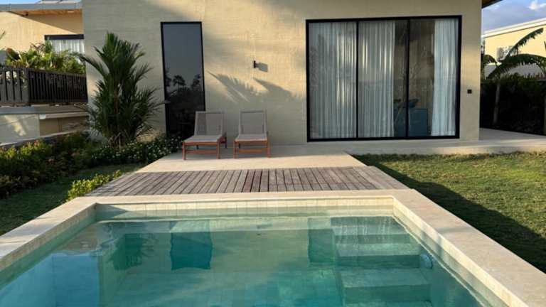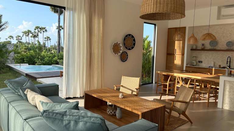 Die Villa verfügt über zwei Schlafzimmer, ein Wohnzimmer und eine voll ausgestattete Küche mit Kühlschrank und Wasserkocher. Es gibt zwei Badezimmer mit Dusche und Haartrockner. Handtücher und Bettwäsche werden bereitgestellt, und die Unterkunft ist klimatisiert.