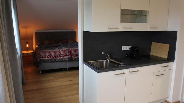 Eine voll ausgestattete Küche mit Herdplatte, Kühlschrank, Kaffeemaschine und Wasserkocher ermöglicht die Zubereitung eigener Mahlzeiten. Restaurants und Einkaufsmöglichkeiten sind in der Umgebung vorhanden.