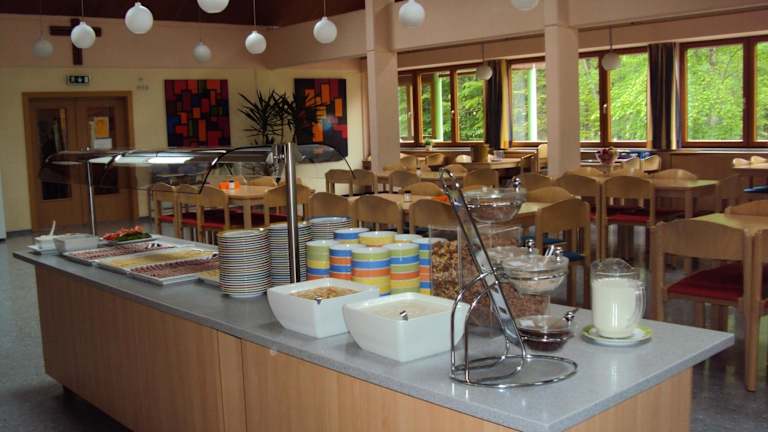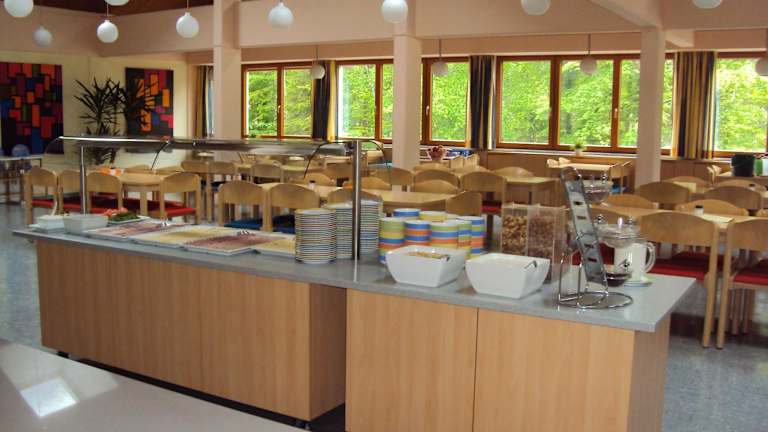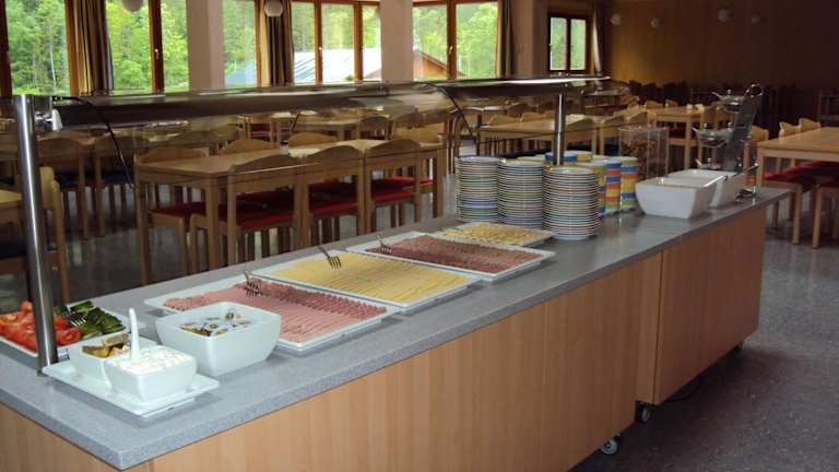Morgens wird ein Frühstücksbuffet im Speisesaal serviert, wo die Gäste die Aussicht über die umliegende Landschaft geniessen können. Ein Getränke- und Kaffeeautomat sowie Snackautomaten stehen zur Verfügung. Für spezielle Ernährungsbedürfnisse kann ebenfalls auf Anfrage gesorgt werden. Im Garten befindet sich ein Grillplatz für gemeinsame Grillabende.