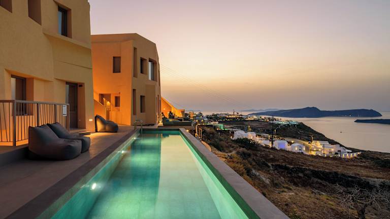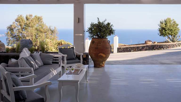 Das Hotel befindet sich in Akrotiri, ca. 4 km vom Strand entfernt. In der Umgebung sind Fira, der Flughafen sowie die Strände von Kamari, Perissa und Perivolos innerhalb von 10 km erreichbar. Der nächste Bahnhof liegt etwa 300 m entfernt und das Stadtzentrum ist 12 km entfernt.